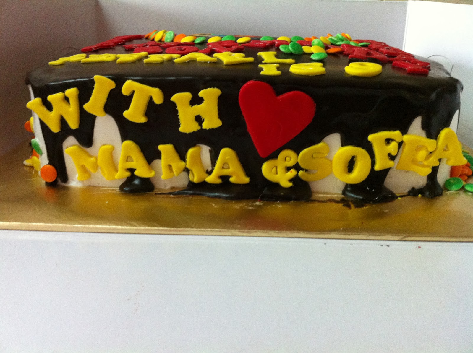 Jadi saya mencadangkan kat amy Butter Choc cake, Filing letak Dark Choc Mouse, di saluti choc Fresh cream n last sekali Tuang Choc Glaze. Cume Di hari kejadian baru saya tersedar saya ketiadaan Choc Fresh Cream dan Bakery juga sudah kehabisan stock. Jadinya, saya buat ape yang ade. Saiz kek juga pada mulanya sy nak buat 16" x 16" tapi bile pk semula, ALAMAK!! pt ais x muat.. hahahha x hagak2 kan.. Jadi tukar 12" x 12". Besar dan agak berat juga. Bolehlah makan semasa party.. :)